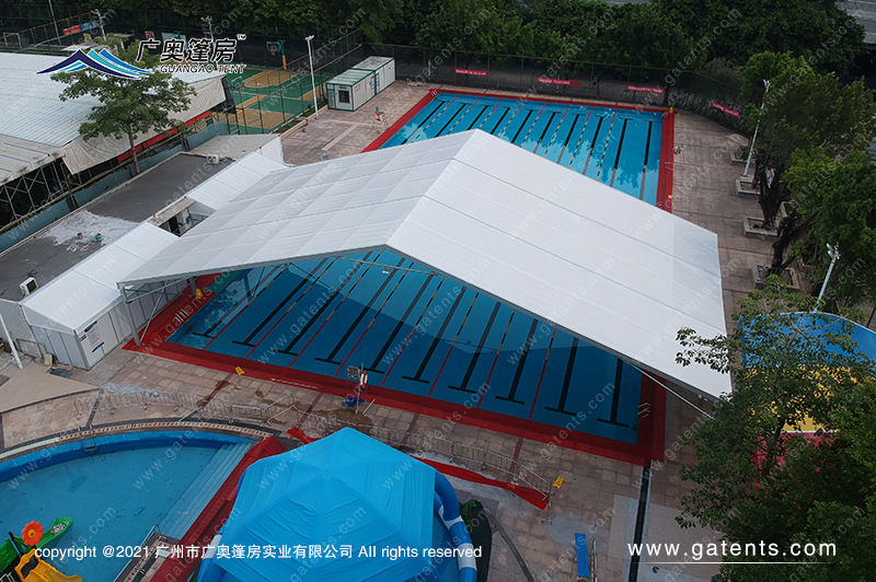 夏季炎炎,有不少人都喜歡出戶外游泳池游泳解暑,戶外露天游泳池多少會(huì)影響到人們游泳的心情,比如下雨天、大熱天、大風(fēng)天等等,也會(huì)掃大家的興。那關(guān)于這問(wèn)題,廣奧建議大面積游泳池能規(guī)劃一半面積搭建篷房篷頂,一半露天游泳池,這樣的話就能解決人們隨便選擇露天還是篷頂遮擋下泳池。來(lái)看看廣奧最近新案例廣東廣州海珠區(qū)星匯園游泳池帳篷篷房。